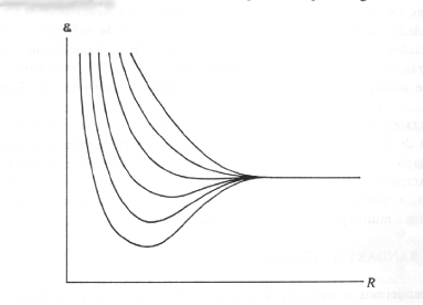 Figura 1: Esquema do desdobramento de um nível de energia num sistema de seis átomos, em função da separação R entre átomos adjacentes.