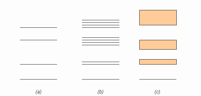 Na Figura 2 (a), as linhas indicam níveis de energia permitidos para os elétrons em um átomos isolado. Para alguns átomos bastante próximos (b), as funções de onda que descrevem os elétrons se superpõem e surgem novos níveis de energia permitidos. Em (c), um mol de átomos representa o somatório de tantas funções de onda que os numerosos níveis de energia permitidos formam bandas contínuas de energia.