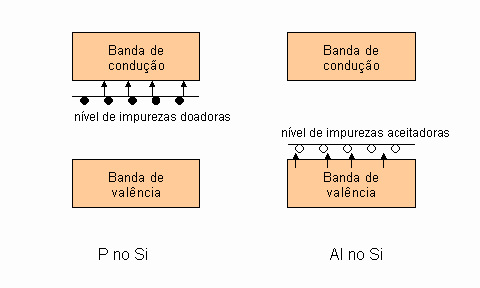 Se por outro lado, um átomo de silício é substituído por um de fósforo, que tem 5 elétrons de valência, então haverá um excesso de elétrons em comparação com o estado anterior do retículo cristalino. Isso representa, energeticamente, a criação de níveis discretos cheios ligeiramente abaixo da banda de condução. Elétrons deste nível cheio podem ser facilmente excitados e passar para a banda de condução logo acima. Em temperatura ambiente, todos esses elétrons em excesso estarão já na banda de condução. Ver Figura 3.