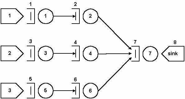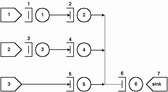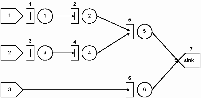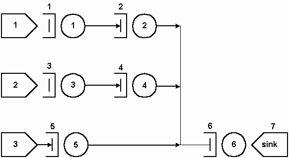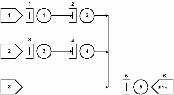 F fila1 s 1 F fila2 s 2 F fila3 s 3 F fila4 s 4 F fila5 s 5 / /Sorvedouro F sink6 s 0 / /Servidores S 1 serv1 21 0.0 e 1 s 2 S 1 serv2 15 0.0 e 2 s 5 S 1 serv3 21 0.0 e 3 s 4 S 1 serv4 15 0.0 e 4 s 5 S 1 serv5 10 0.0 e 5 s 6 / /Fim |