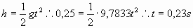 O próximo passo consiste em calcular o tempo de vôo ou queda das duas esferas, que são idênticos (pois as duas esferas iniciam a queda da mesma altura). Utilizando a equação de cinemática adaptada para queda livre, faz-se o cálculo.