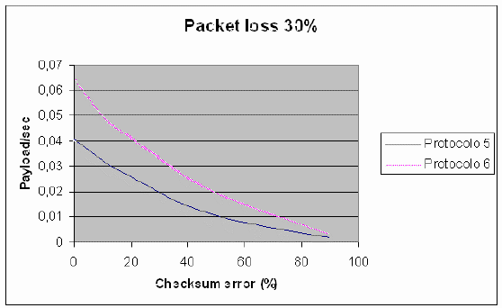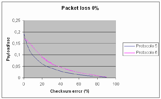O Protocolo 6 mostra-se sempre superior ao Protocolo 5 nas hipóteses analisadas, com exceção de um meio com 0% de Packet Loss e Checksum Error menor que 3%, quando então o Protoloco 5 mostra-se mais eficiente que o Protocolo 6 em termos taxa de Payloads entregues por segundo.