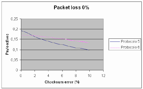 Como mostram os gráficos acima, até a região de Checksum Error de cerca de 2%, o Protocolo 5 mostra-se mais eficiente que o Protocolo 6 quanto a payloads entregues por unidade de tempo. A diferença é cerca de 13% a mais de payloads entregues para o Protocolo 5 em meio de 0% de packet loss e packet checksum error, e de cerca de 5,6% a mais de payloads entregues para o Protocolo 5 em meio de 0% de packet loss e 1% de checksum error. Em meios livres de erros, pode-se considerar o Protocolo 5 melhor que o Protocolo 6, no quesito entrega de pode-se considerar o Protocolo 5 melhor que o Protocolo 6, no quesito taxa de entrega de payloads por unidade de tempo.