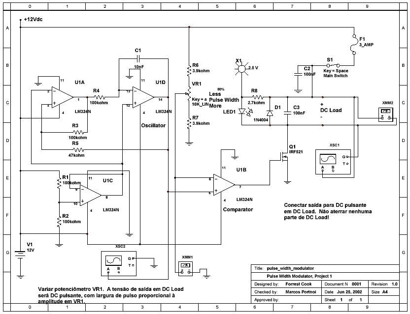 O circuito aqui descrito na Figura 2 é um controlador de entrada DC e saída DC tipo PWM, com alimentação de 12 volts, e foi projetado para ser basicamente um controlador de lâmpadas (dimmer) ou de motores DC.