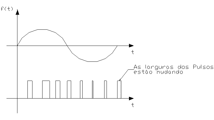 Também conhecida por PWM, do inglês Pulse Width Modulation, este tipo de modulação mantém a amplitude dos pulsos constantes e varia-se a sua largura proporcionalmente aos valores de f(t) (sinal modulador) nos instantes correspondentes, como mostra a Figura 1.