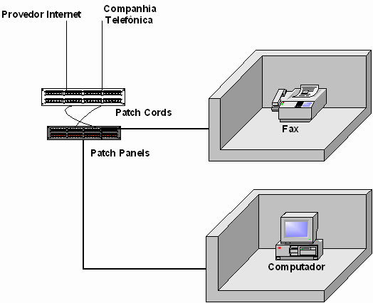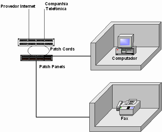 A Figura 3 ilustra uma manobra do patch-panel. Em um determinado recinto, há um computador conectado à Internet. Em outro, há um aparelho de fax. Decide-se intercambiar estes equipamentos, colocando o computador no recinto do fax e vice-versa. As conexões para cada equipamento são rapidamente e facilmente configuradas bastando trocar os patch-cords correspondentes de posição no patch-panel.