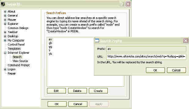 Figure 2: TweakUI, configuring address bar search prefixes |