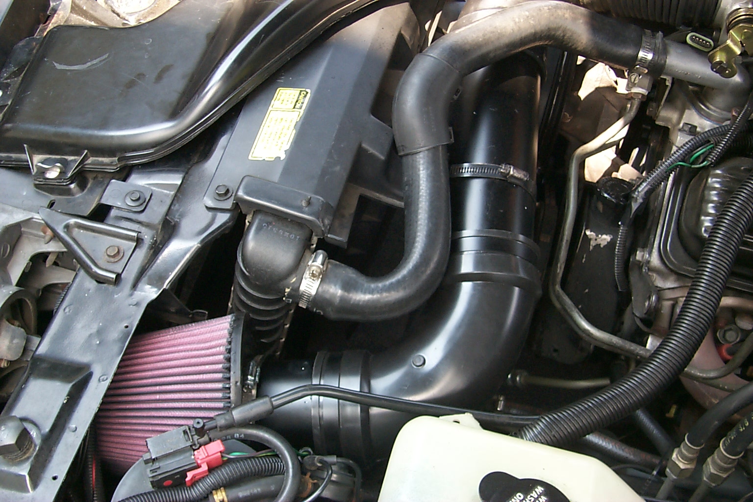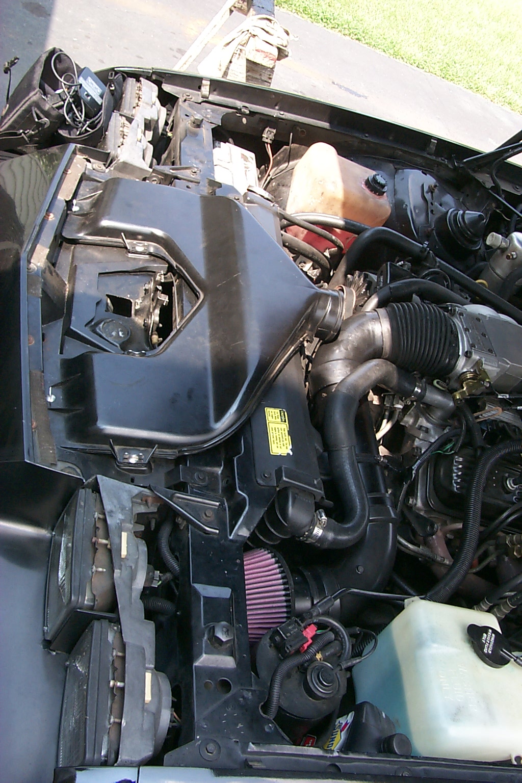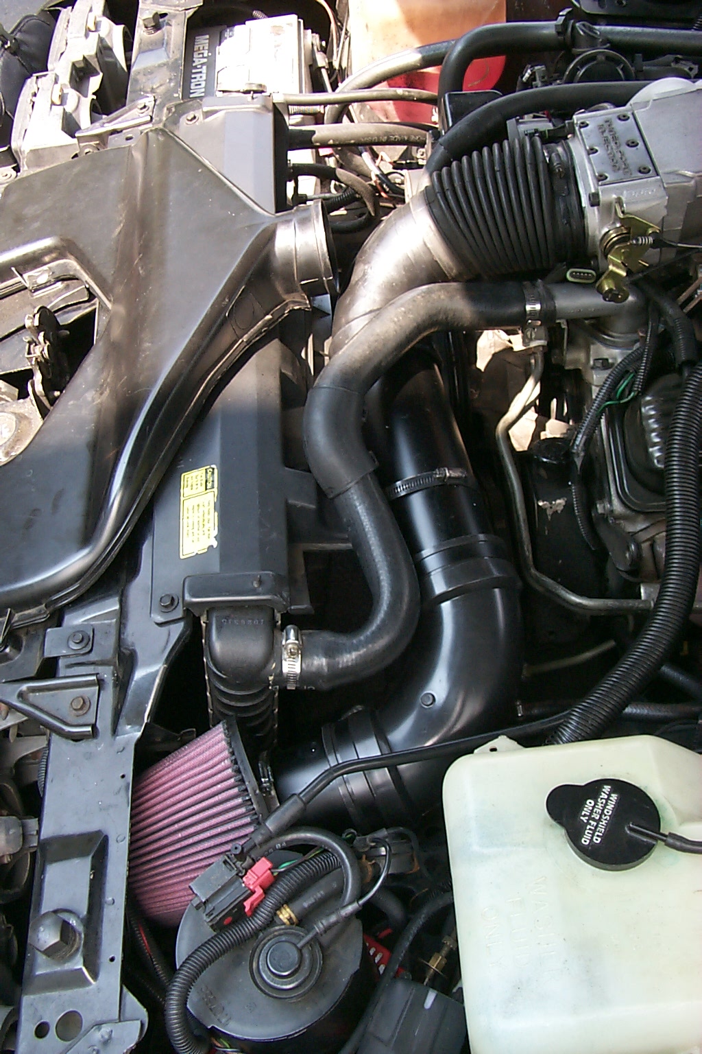 Since I've been "A/C Delete" and with a broken cruise control for about 10 years, I figured I would reclaim their space and installed a homemade cold air pickup for my Speed-Density converted motor. The stock rubber TB piece is wrapped around a PVC (male/female) elbow. 3inch PVC continues under the top radiator hose to a rubber (female/female) elbow. A second small section of 3inch PVC then connects into the K&N cone fitted behind the high beam area. White PVC and chrome clamps have all be painted with black hi-temp engine paint. Initial G-Tech runs showed 25hp (rear wheel) improvement!!! 1/4-mile times to follow..
